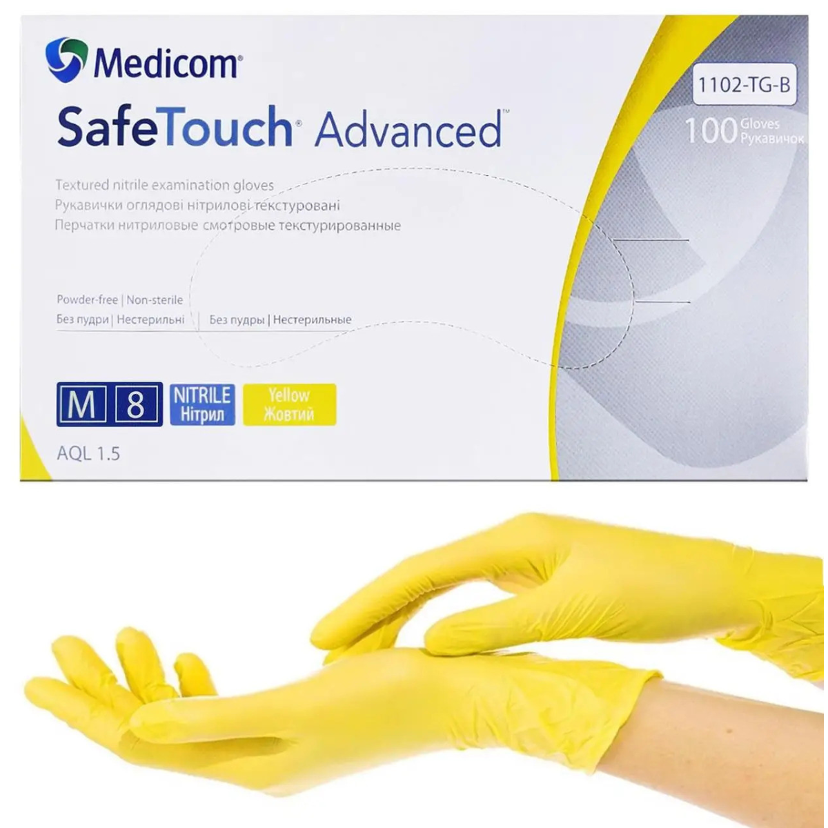 Рукавички нітрилові Medicom SafeTouch Advanced Жовті без пудри - рукавички поєднують у собі всі властивості нітрилу та елегантний колір. Вони добре підходять, коли потрібно поєднання стійкості до хімічних речовин і збереження кольору. Ергономічний дизайн забезпечує щільне облягання рук та підвищує свободу руху, що призводить до зниження втоми. Повністю текстуроване для надійного утримання предметів. Ідеальні для технічних робіт, а також для татуажу та косметології.