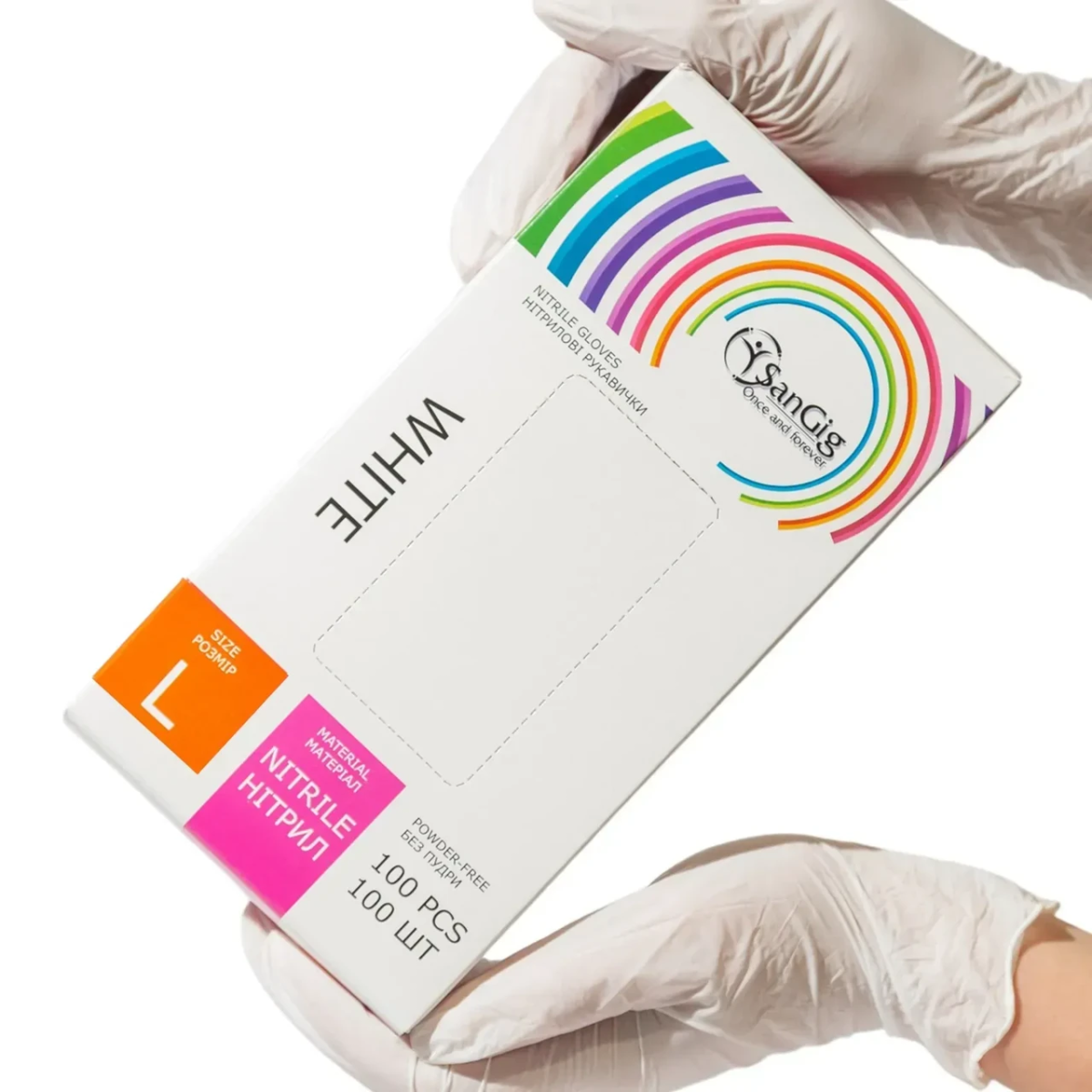 • Рукавички нітрилові SanGig, щільність 3.5 г. - білі (100 шт)  L (8-9)